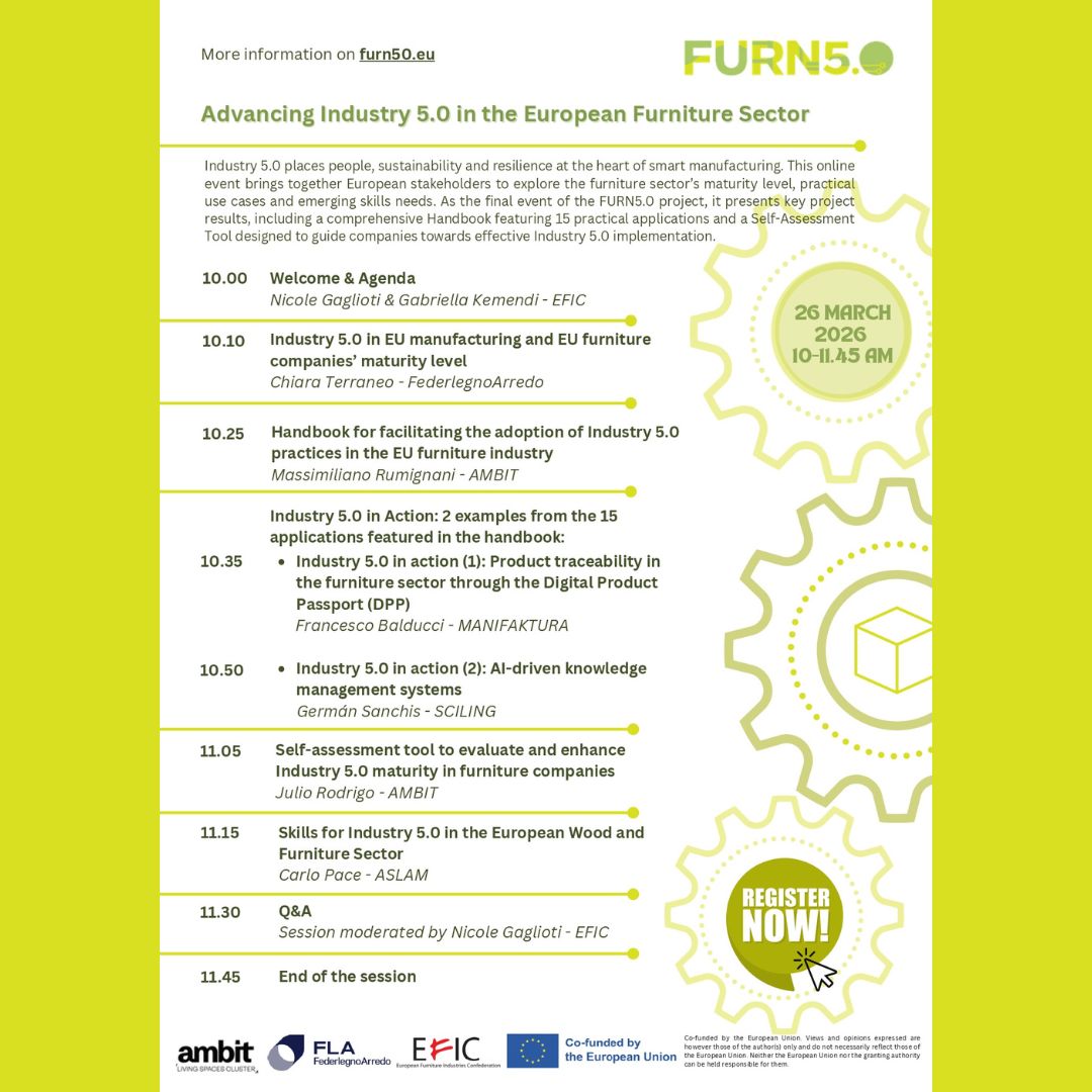 On 26 March 2026, from 10:00 to 11:45 CET, the FURN5.0 Final Conference – Advancing Industry 5.0 in the European Furniture Sector will take place online, marking the conclusion of the FURN5.0 project and presenting its main results to the wider furniture ecosystem.